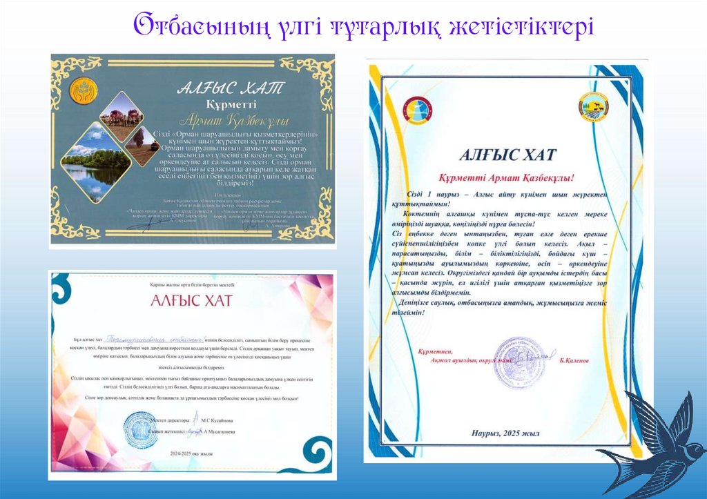 қарайды. Армат Қазбекұлы бірнеше мәрте алғыс хаттармен марапатталып, еңбектегі