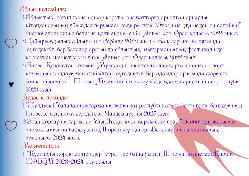 әлемде”атты ән байқауының ІІ орын жүлдегері. Балалар шығармашылық