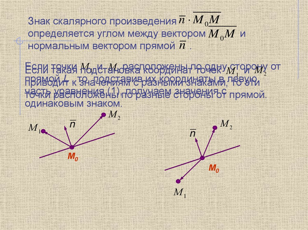 Знак скалярного произведения n M 0 Mопределяется углом между вектором M 0 M и