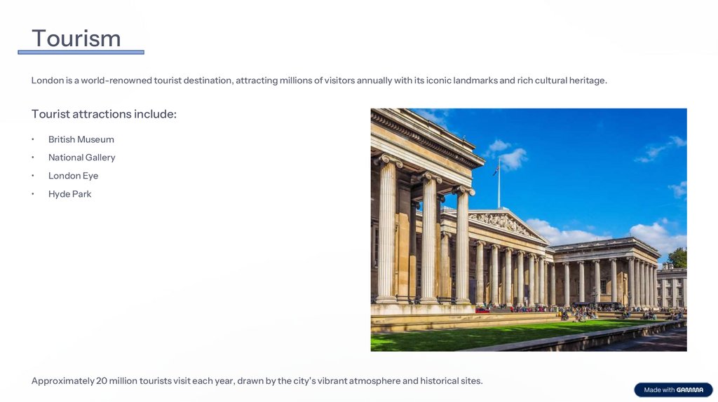TourismLondon is a world-renowned tourist destination, attracting millions of visitors annually with its iconic landmarks and rich cultural heritage.