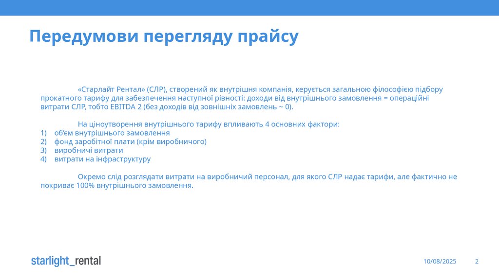 Передумови перегляду прайсу«Старлайт Рентал» (СЛР), створений як внутрішня компанія, керується загальною філософією підбору