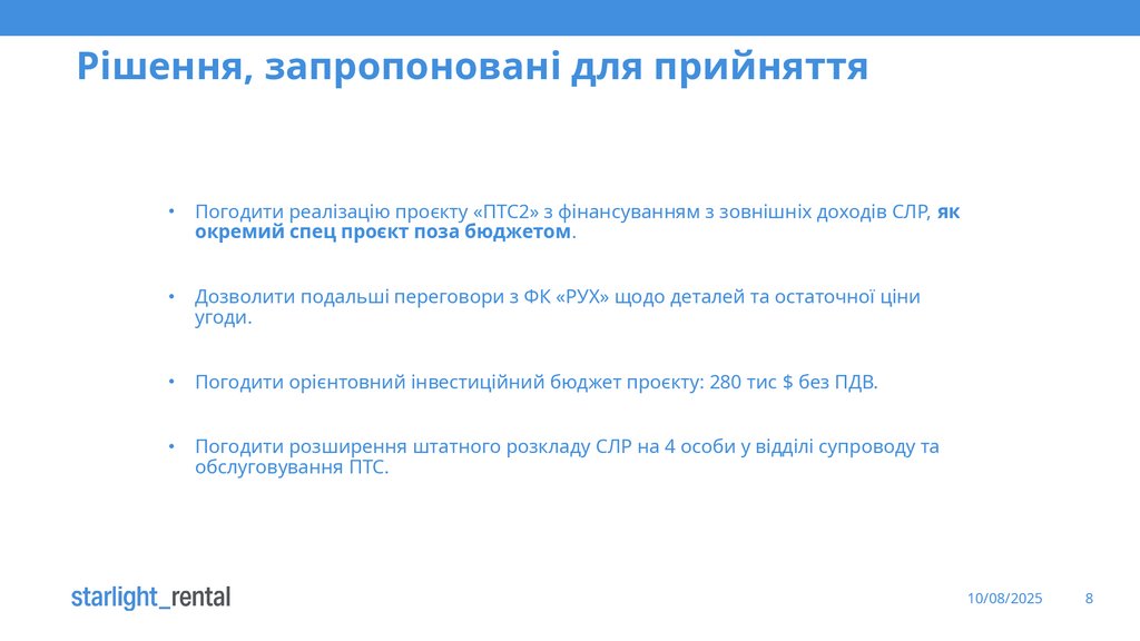 Рішення, запропоновані для прийняттяПогодити реалізацію проєкту «ПТС2» з фінансуванням з зовнішніх доходів СЛР, як