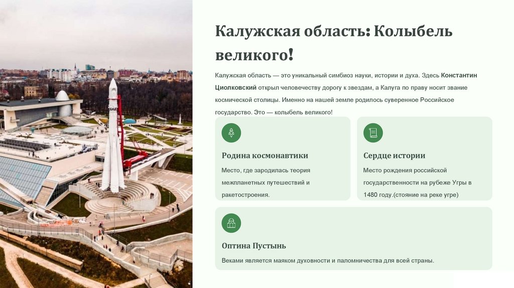 Калужская область — это уникальный симбиоз науки, истории и духа. Здесь Константин