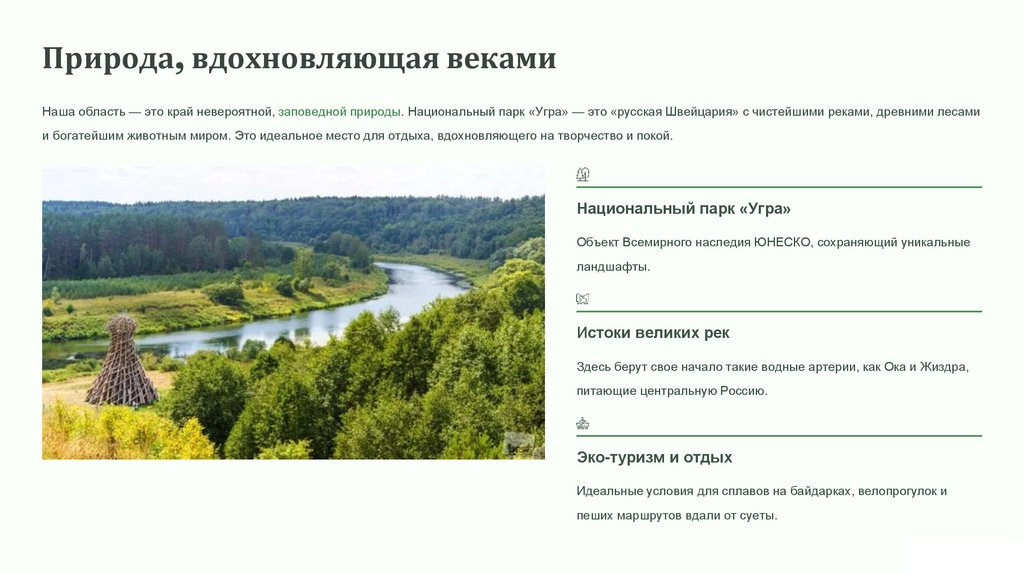 Природа, вдохновляющая векамиНаша область — это край невероятной, заповедной природы. Национальный парк «Угра» — это «русская Швейцария» с чистейшими реками, древними лесами