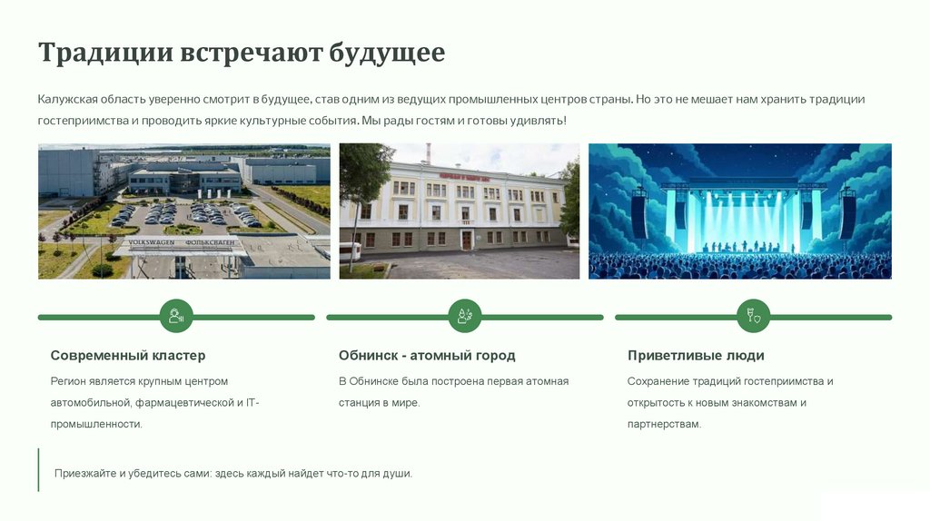 Традиции встречают будущееКалужская область уверенно смотрит в будущее, став одним из ведущих промышленных центров страны. Но это не мешает нам хранить традиции