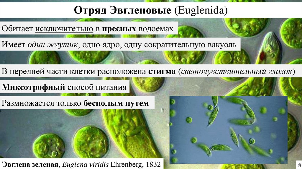 Отряд Эвгленовые (Euglenida)Обитает исключительно в пресных водоемах