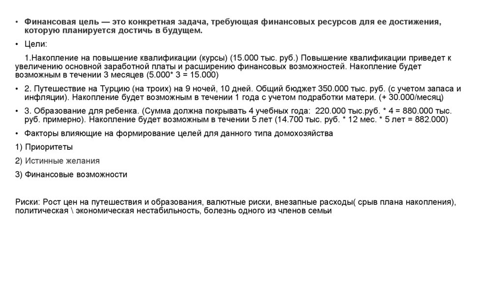 • Финансовая цель — это конкретная задача, требующая финансовых ресурсов для ее достижения,которую планируется достичь в будущем.