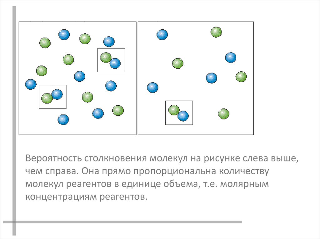 Вероятность столкновения молекул на рисунке слева выше,чем справа. Она прямо пропорциональна количеству