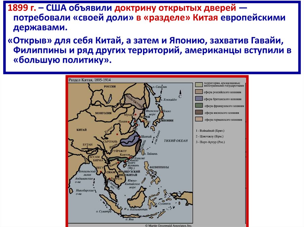 1899 г. – США объявили доктрину открытых дверей —потребовали «своей доли» в «разделе» Китая европейскими