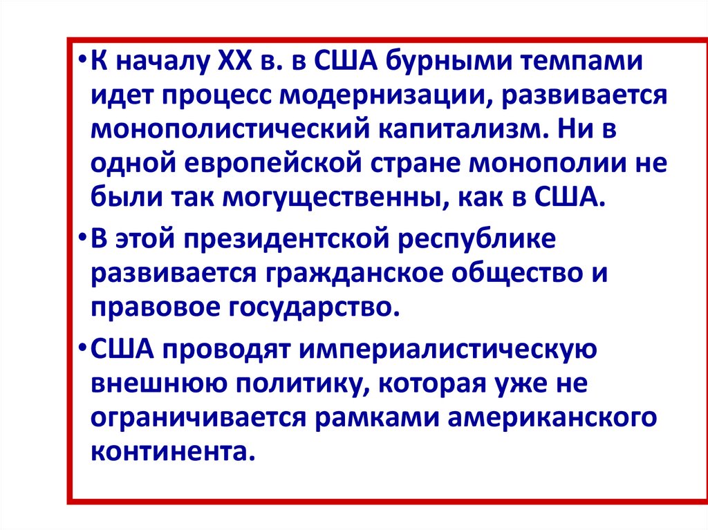 •К началу XX в. в США бурными темпамиидет процесс модернизации, развивается
