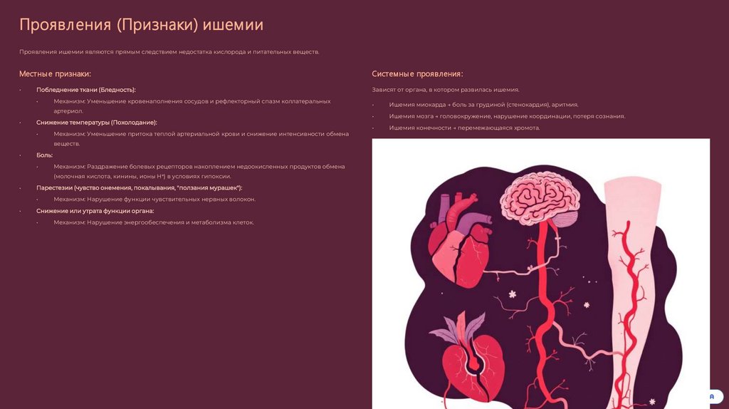 Проявления (Признаки) ишемииПроявления ишемии являются прямым следствием недостатка кислорода и питательных веществ.