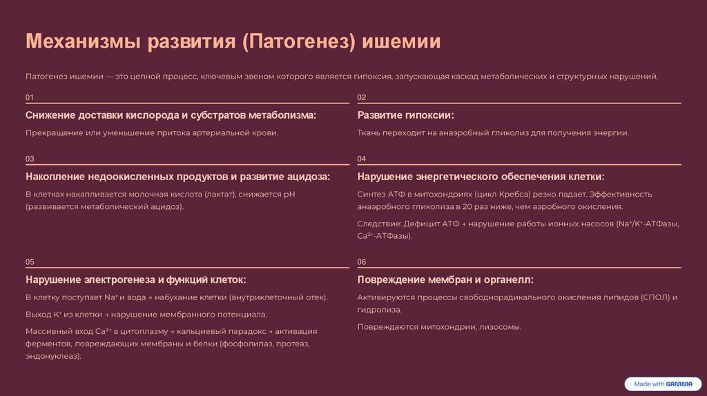 Механизмы развития (Патогенез) ишемииПатогенез ишемии — это цепной процесс, ключевым звеном которого является гипоксия, запускающая каскад метаболических и структурных нарушений.