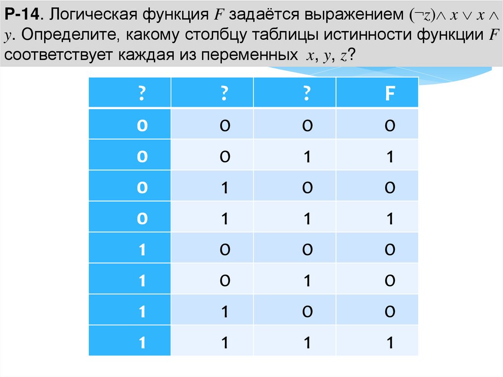 Р-14. Логическая функция F задаётся выражением (¬z) x xy. Определите, какому столбцу таблицы истинности функции F
