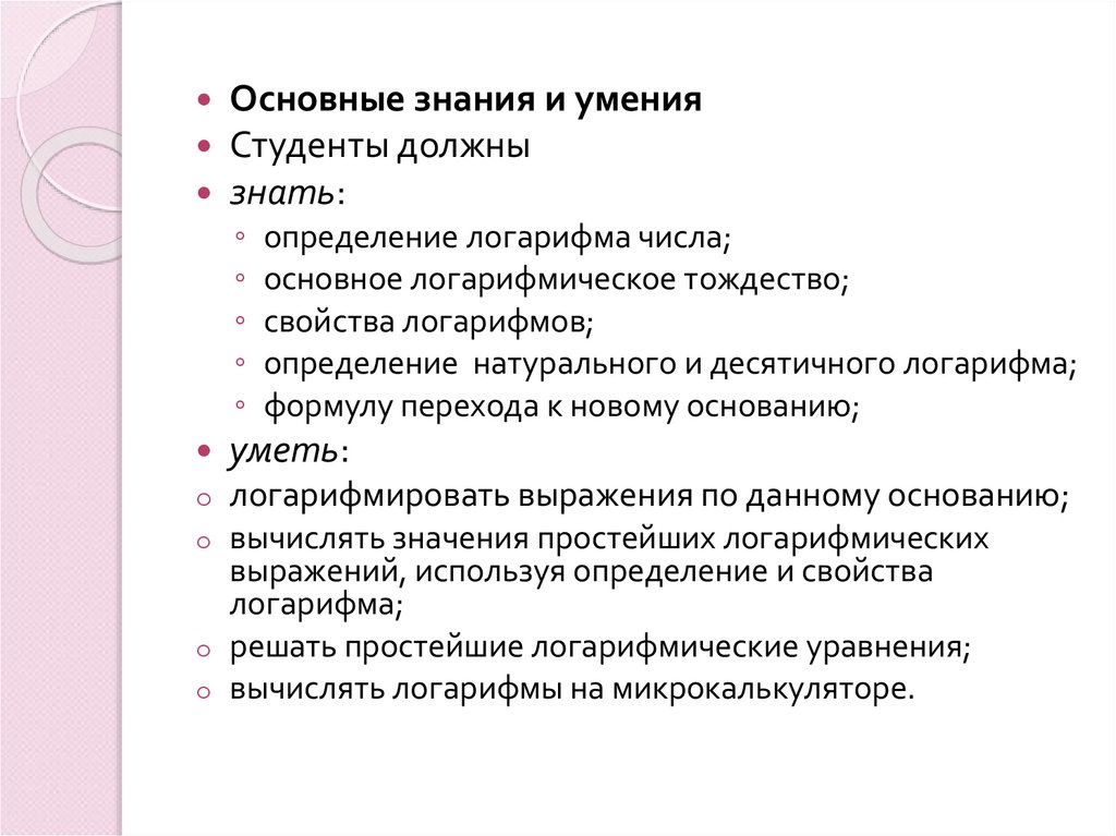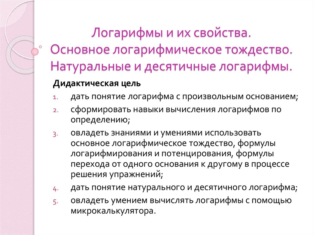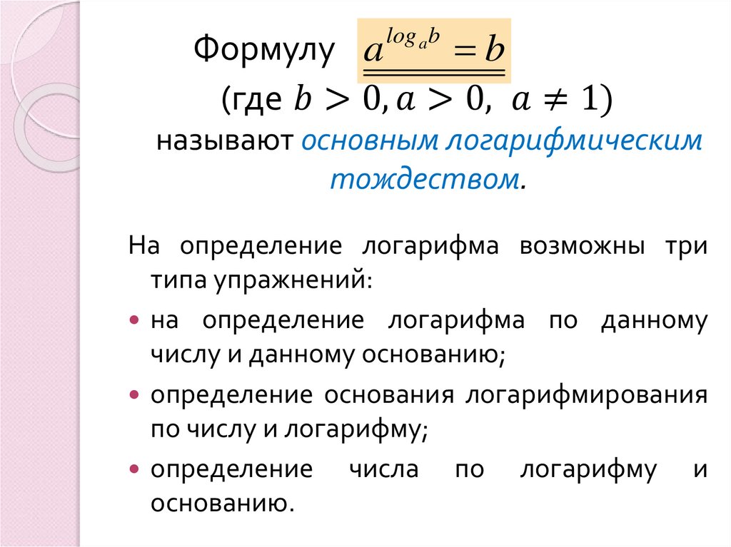 1. Логарифмы и их свойства. Основное логарифмическое тождество. Натуральные и десятичные логарифмы.