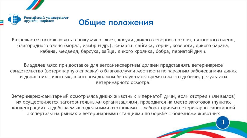 Общие положенияРазрешается использовать в пищу мясо: лося, косули, дикого северного оленя, пятнистого оленя,