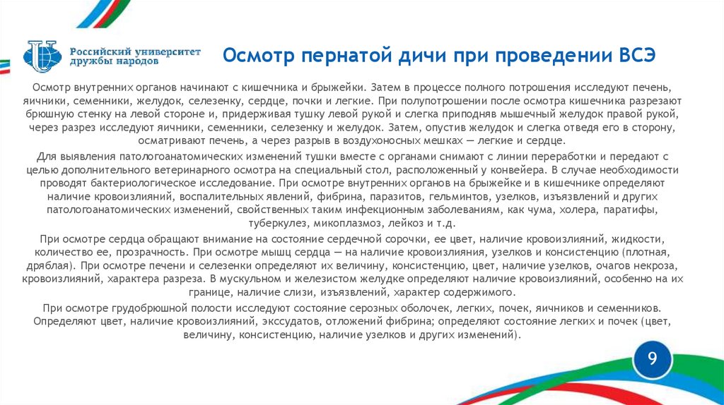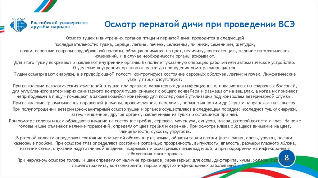 Осмотр пернатой дичи при проведении ВСЭОсмотр тушек и внутренних органов птицы и пернатой дичи проводится в следующей
