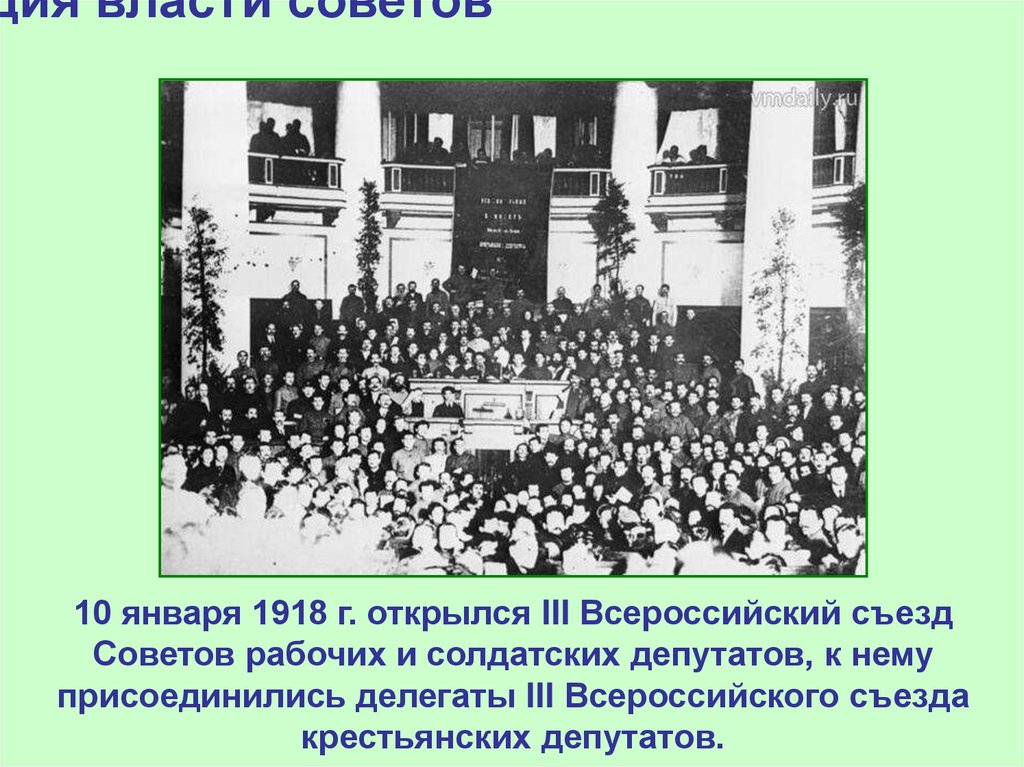ция власти советов10 января 1918 г. открылся III Всероссийский съезд