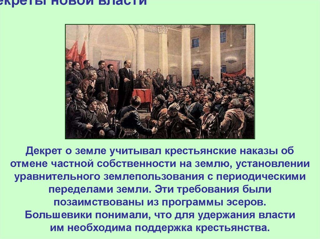 екреты новой властиДекрет о земле учитывал крестьянские наказы об