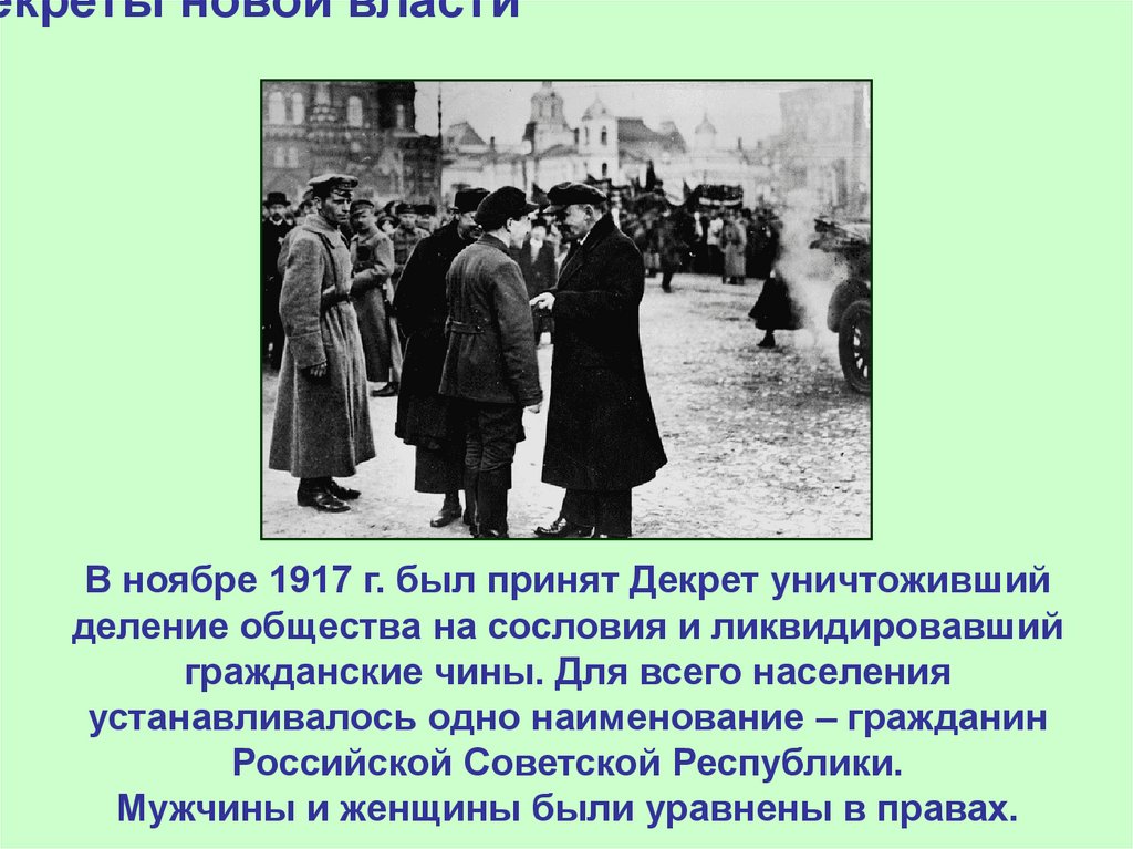 екреты новой властиВ ноябре 1917 г. был принят Декрет уничтоживший