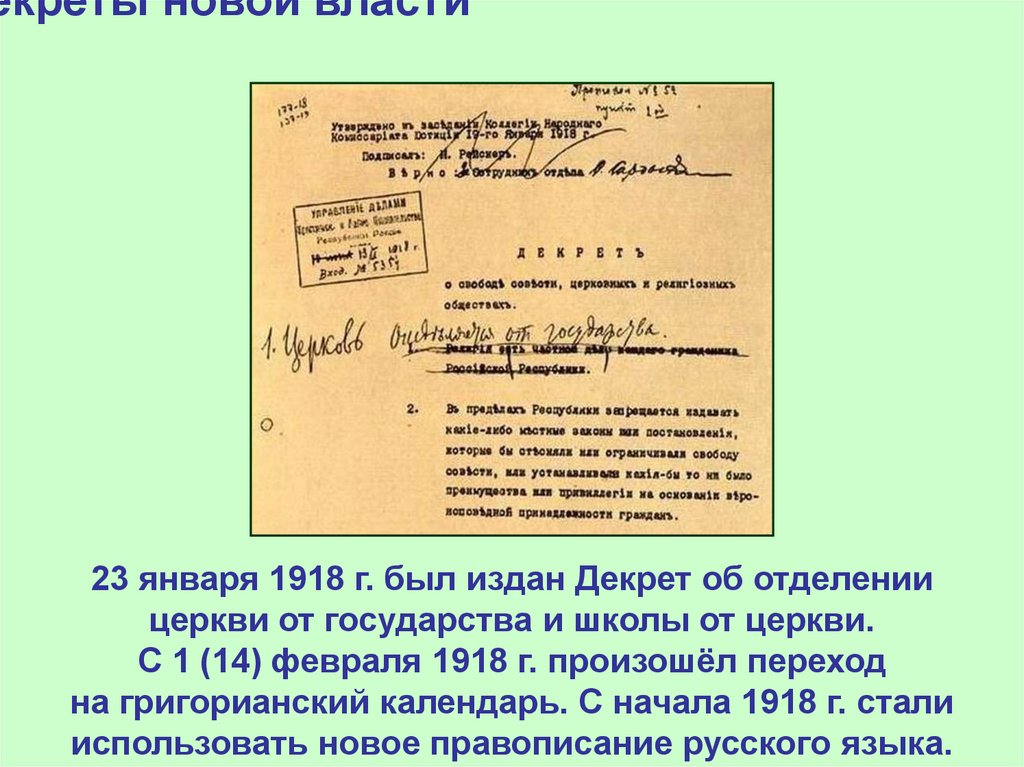 екреты новой власти23 января 1918 г. был издан Декрет об отделении