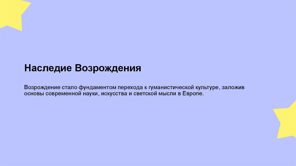 Наследие ВозрожденияВозрождение стало фундаментом перехода к гуманистической культуре, заложив
