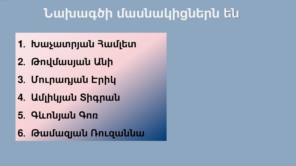 Նախագծի մասնակիցներն են1․ Խաչատրյան Համլետ