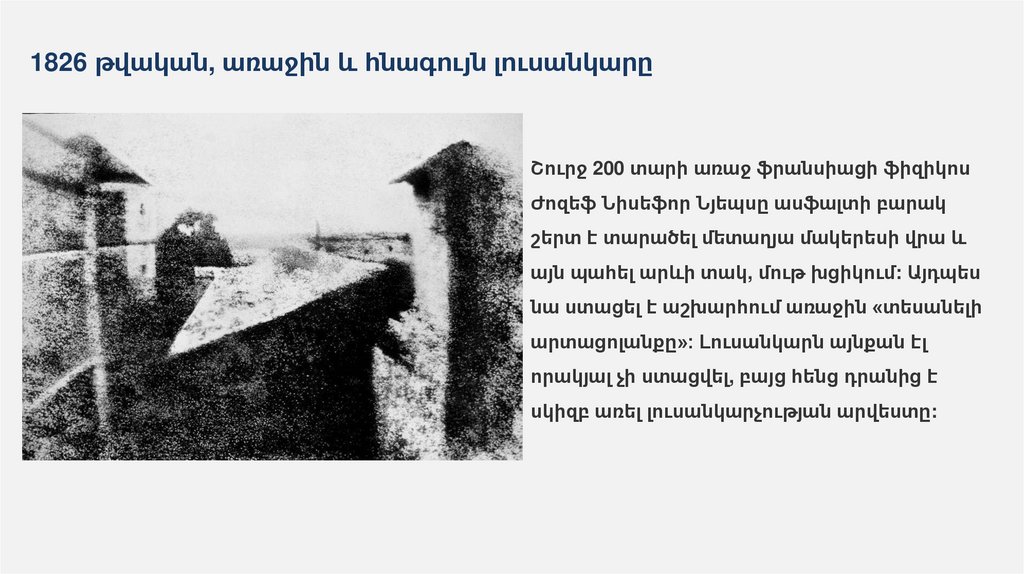 1826 թվական, առաջին և հնագույն լուսանկարըՇուրջ 200 տարի առաջ ֆրանսիացի ֆիզիկոս