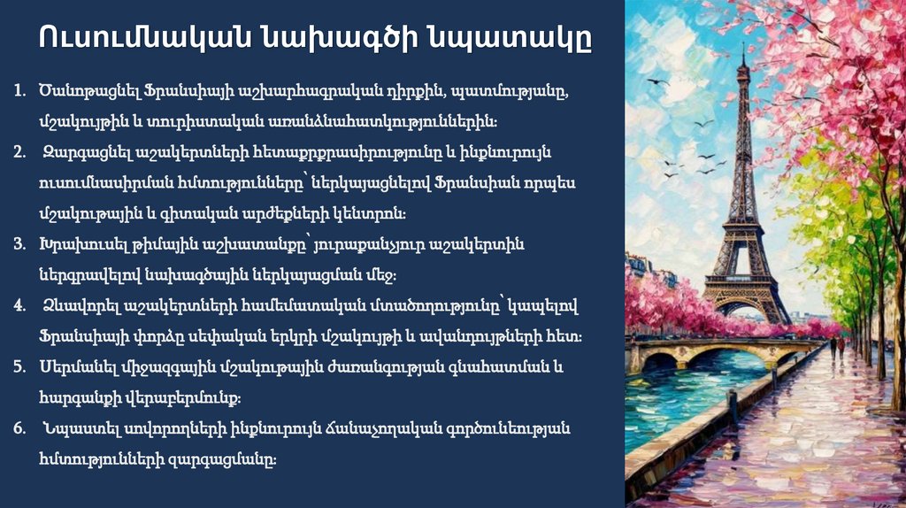 Ուսումնական նախագծի նպատակը1. Ծանոթացնել Ֆրանսիայի աշխարհագրական դիրքին, պատմությանը,