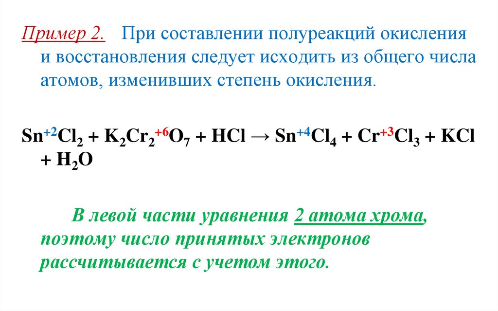 Пример 2. При составлении полуреакций окисленияи восстановления следует исходить из общего числа