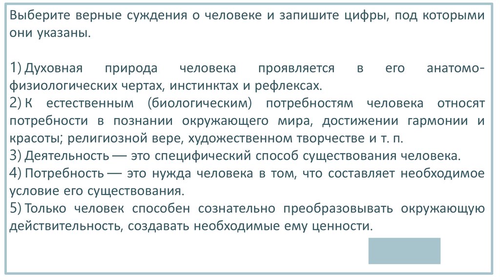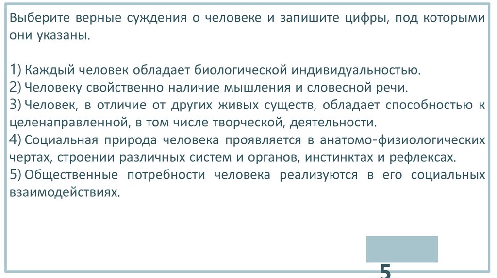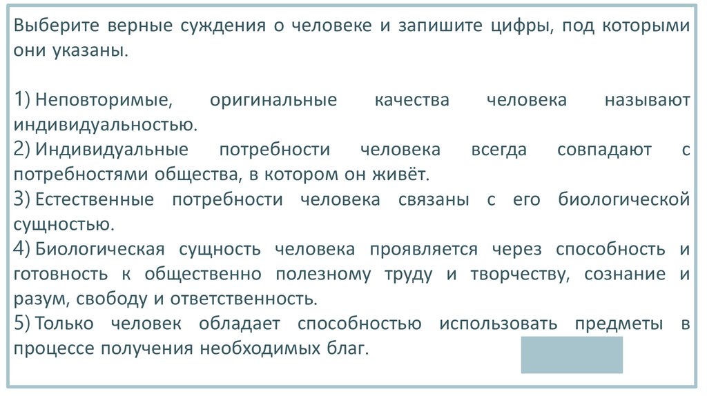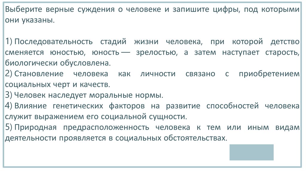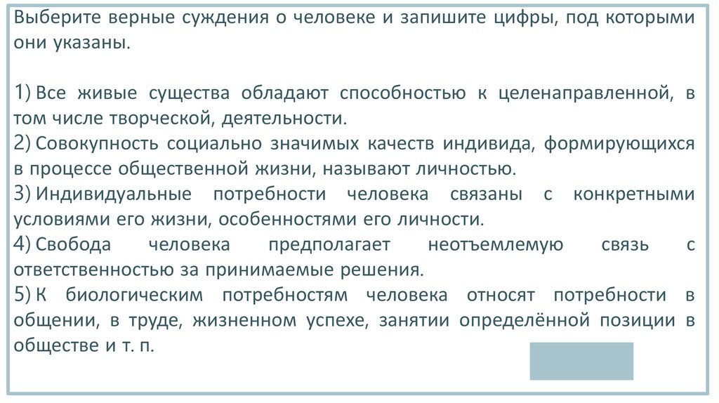 Выберите верные суждения о человеке и запишите цифры, под которымиони указаны.