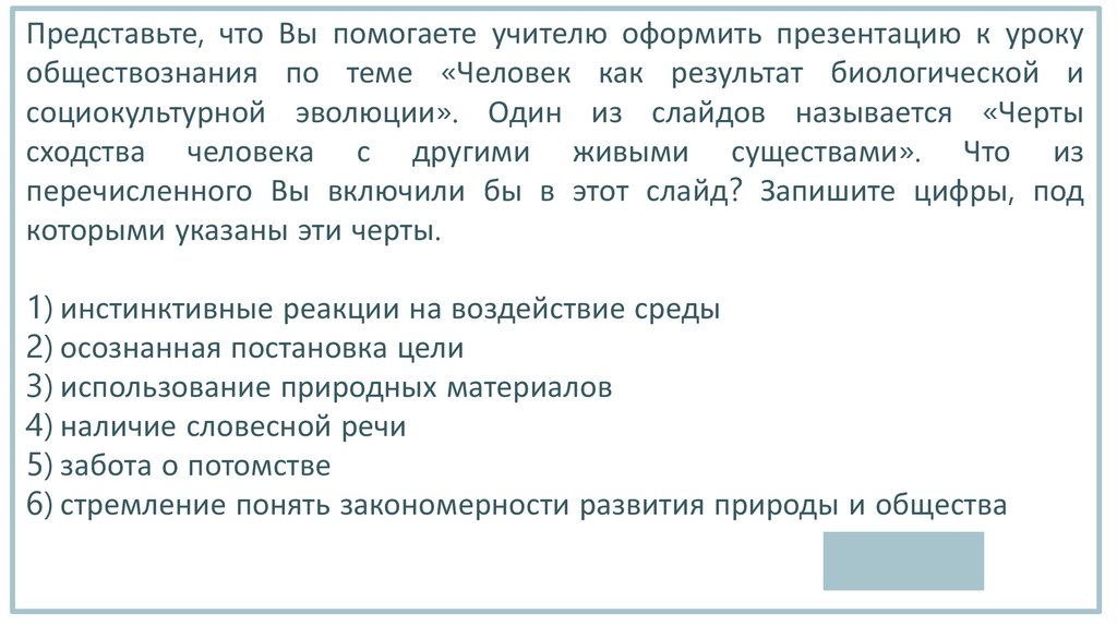Представьте, что Вы помогаете учителю оформить презентацию к урокуобществознания по теме «Человек как результат биологической и