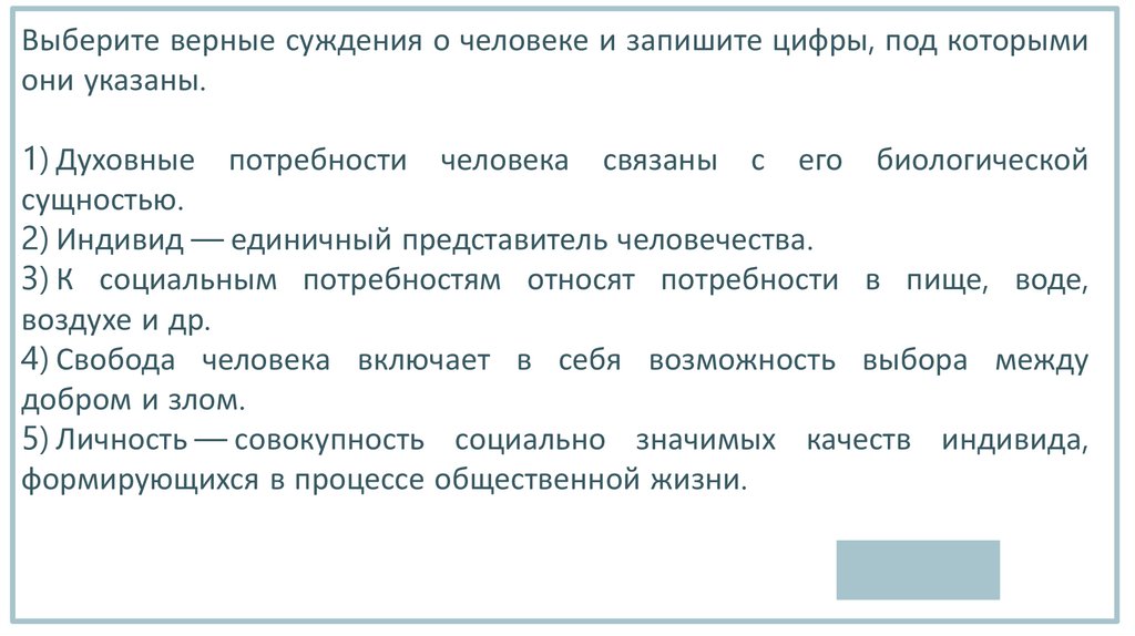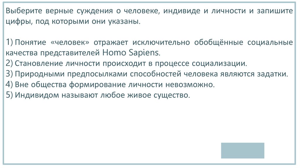 Выберите верные суждения о человеке, индивиде и личности и запишитецифры, под которыми они указаны.