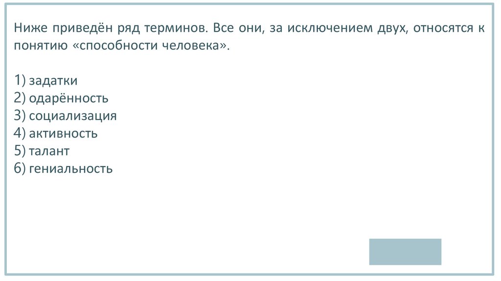 Ниже приведён ряд терминов. Все они, за исключением двух, относятся кпонятию «способности человека».