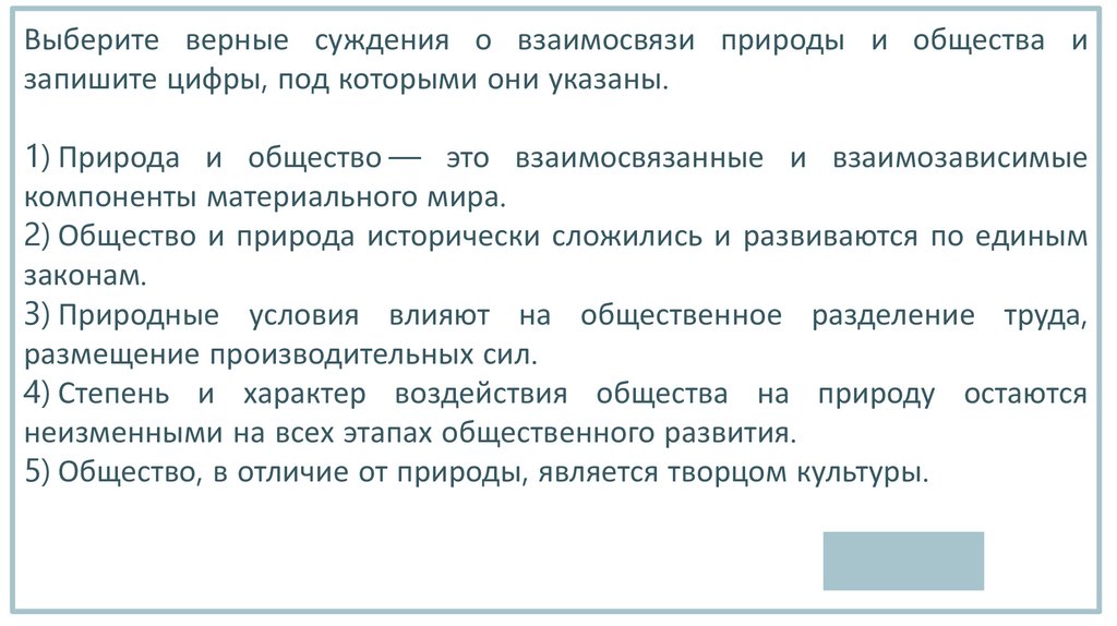 Выберите верные суждения о взаимосвязи природы и общества изапишите цифры, под которыми они указаны.