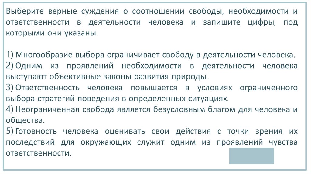 Выберите верные суждения о соотношении свободы, необходимости иответственности в деятельности человека и запишите цифры, под