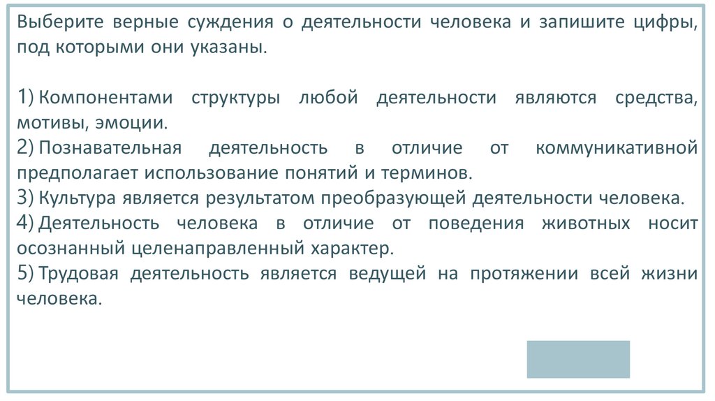 Выберите верные суждения о деятельности человека и запишите цифры,под которыми они указаны.
