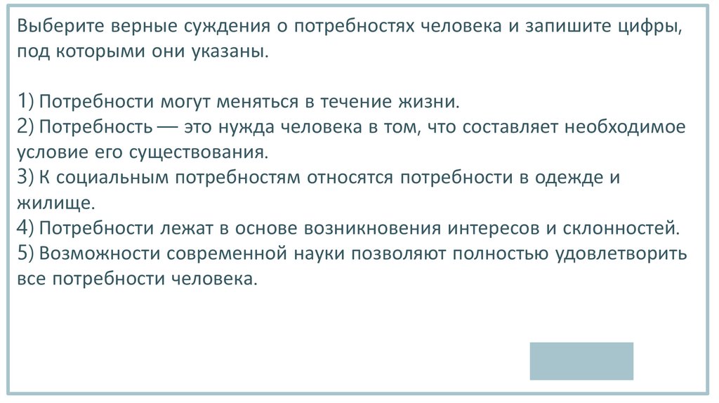 Выберите верные суждения о потребностях человека и запишите цифры,под которыми они указаны.
