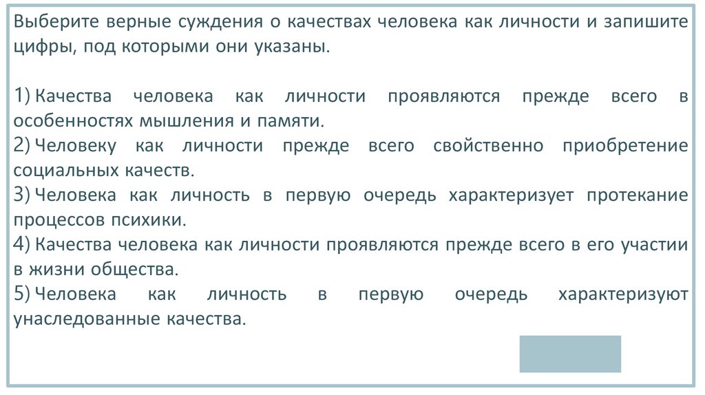 Выберите верные суждения о качествах человека как личности и запишитецифры, под которыми они указаны.