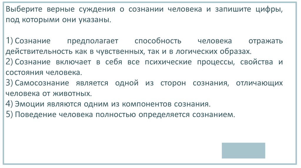 Выберите верные суждения о сознании человека и запишите цифры,под которыми они указаны.