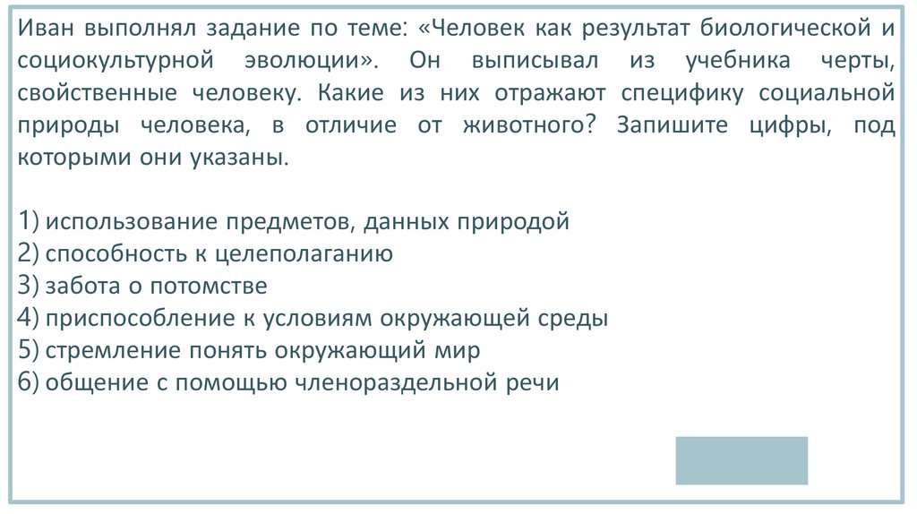 Иван выполнял задание по теме: «Человек как результат биологической исоциокультурной эволюции». Он выписывал из учебника черты,