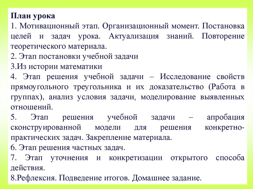 План урока1. Мотивационный этап. Организационный момент. Постановка