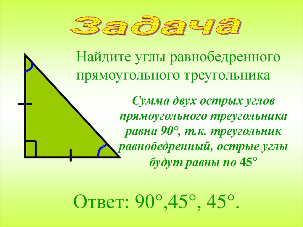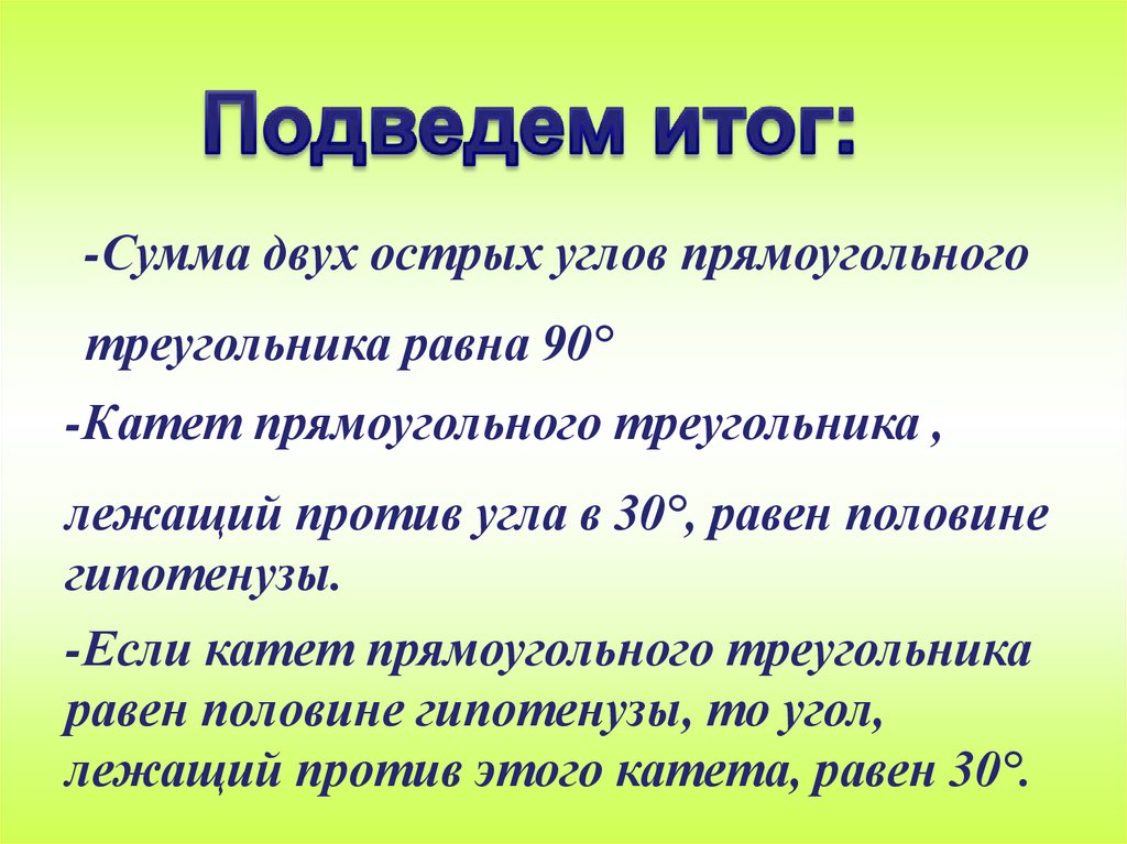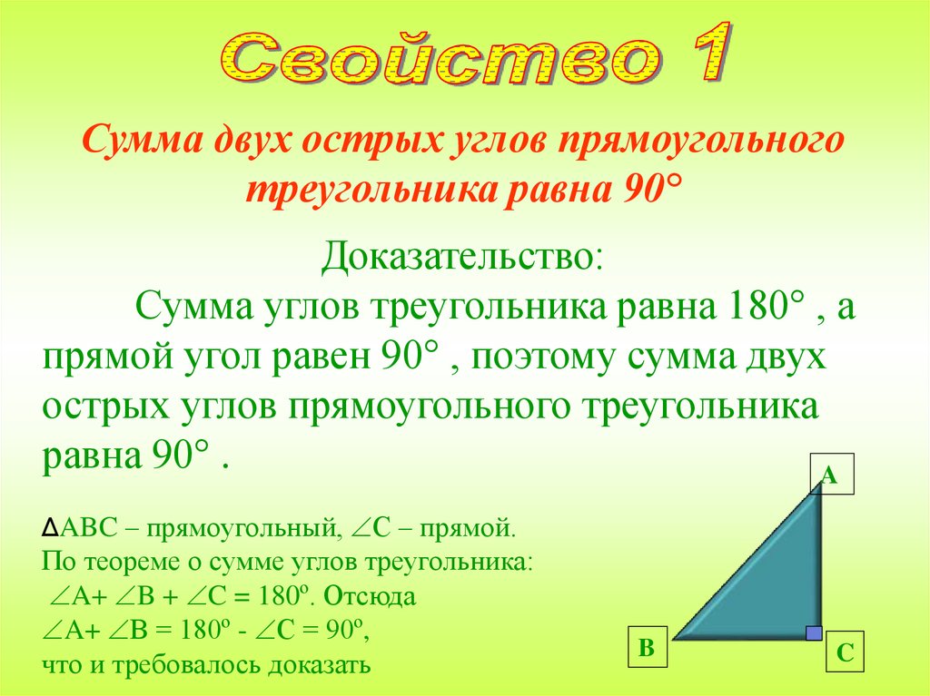 -Сумма двух острых углов прямоугольноготреугольника равна 90°
