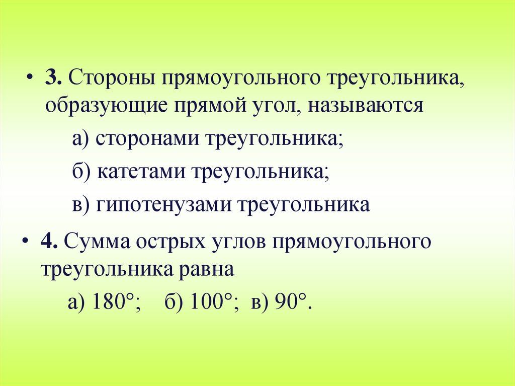 • 3. Стороны прямоугольного треугольника,образующие прямой угол, называются
