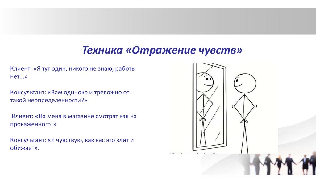 Техника «Отражение чувств»Клиент: «Я тут один, никого не знаю, работы