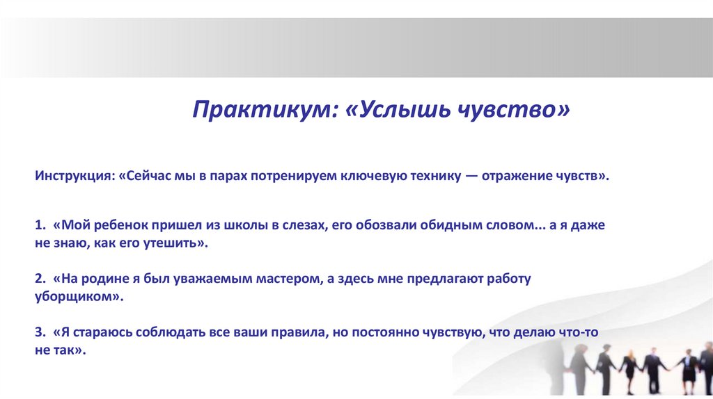 Практикум: «Услышь чувство»Инструкция: «Сейчас мы в парах потренируем ключевую технику — отражение чувств».