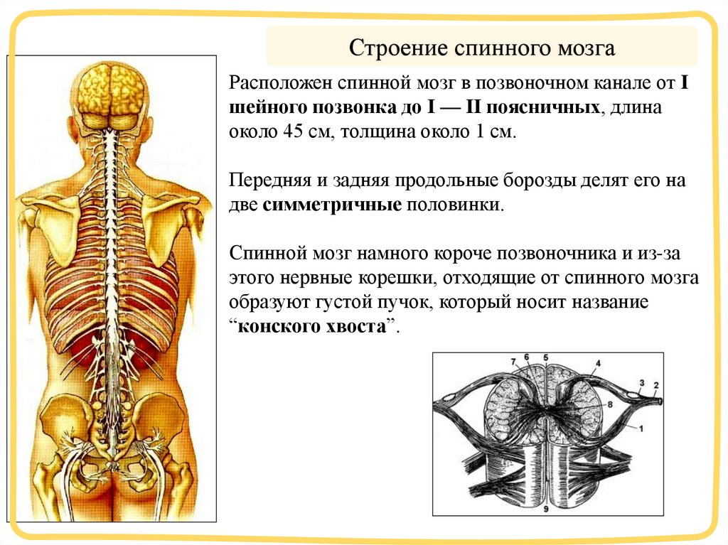 Строение спинного мозгаРасположен спинной мозг в позвоночном канале от I