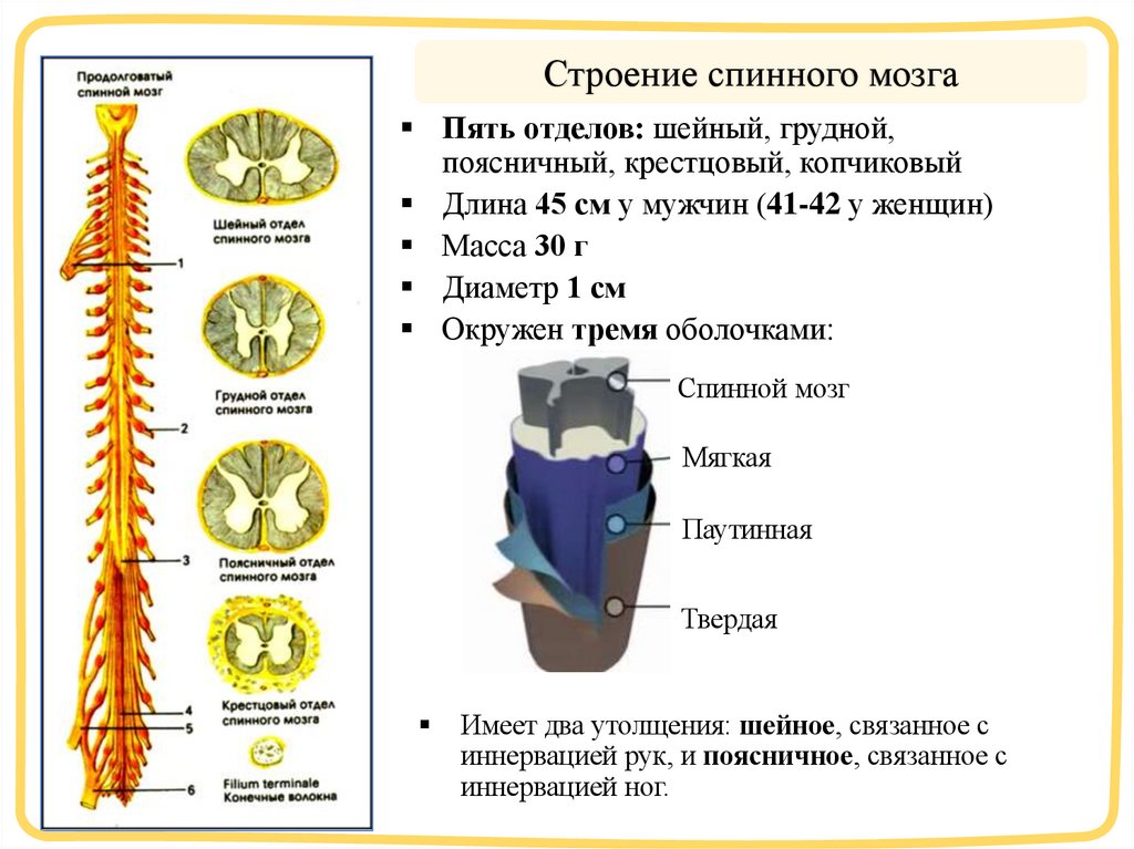Строение спинного мозгаПять отделов: шейный, грудной,