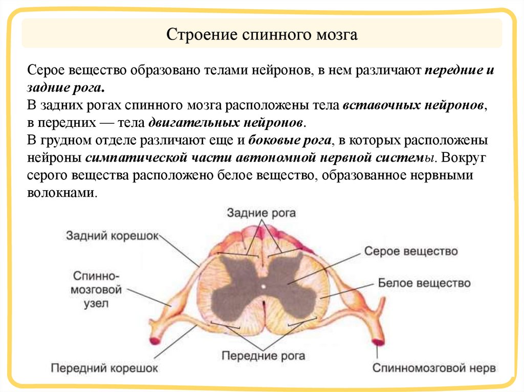 Строение спинного мозгаСерое вещество образовано телами нейронов, в нем различают передние и