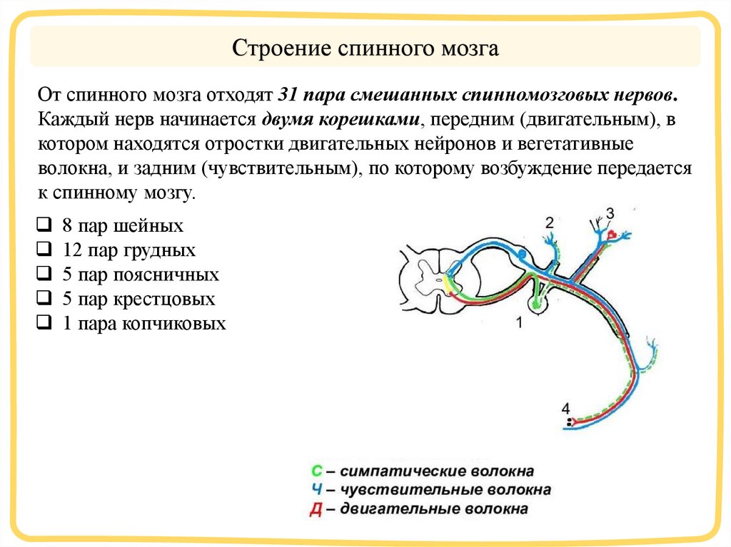 Строение спинного мозгаОт спинного мозга отходят 31 пара смешанных спинномозговых нервов.