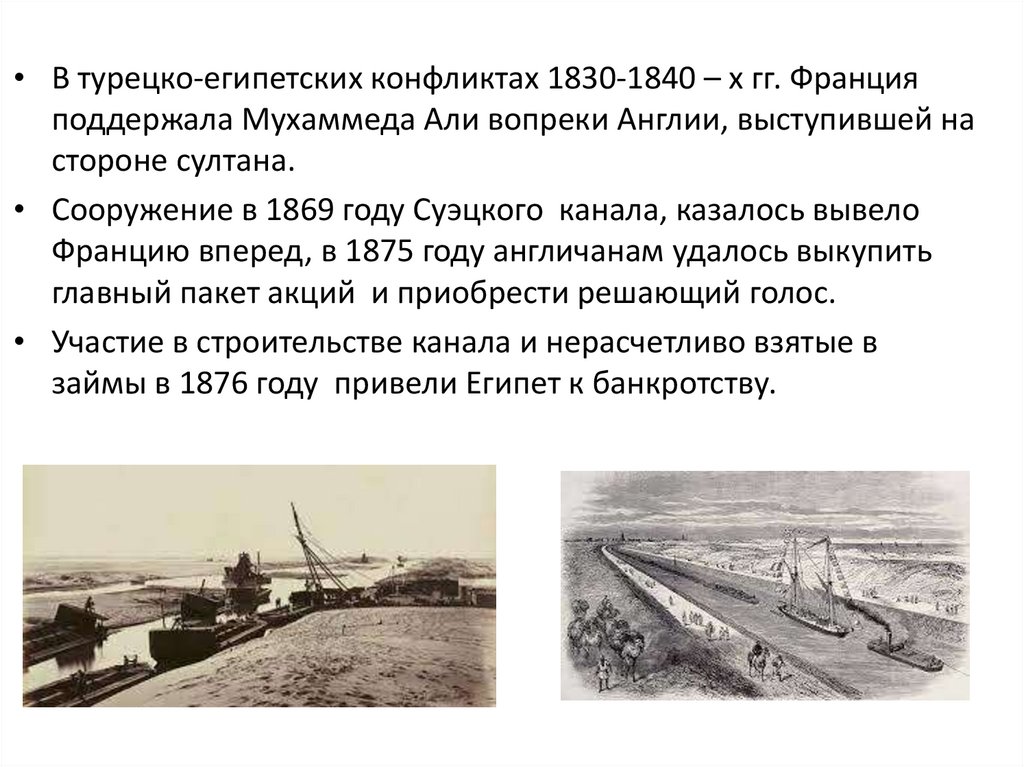 • В турецко-египетских конфликтах 1830-1840 – х гг. Францияподдержала Мухаммеда Али вопреки Англии, выступившей на